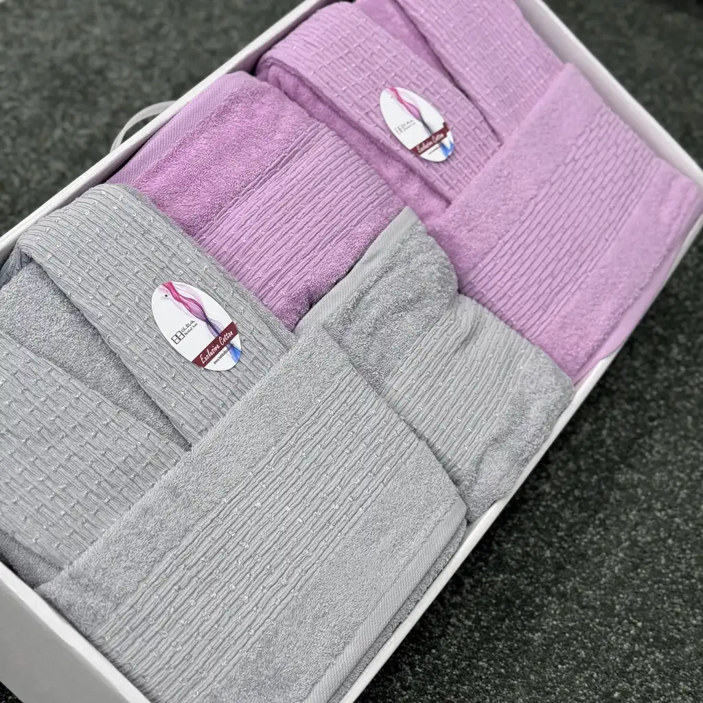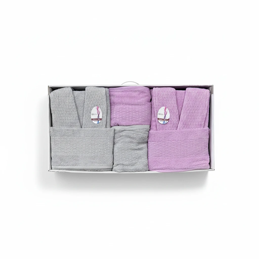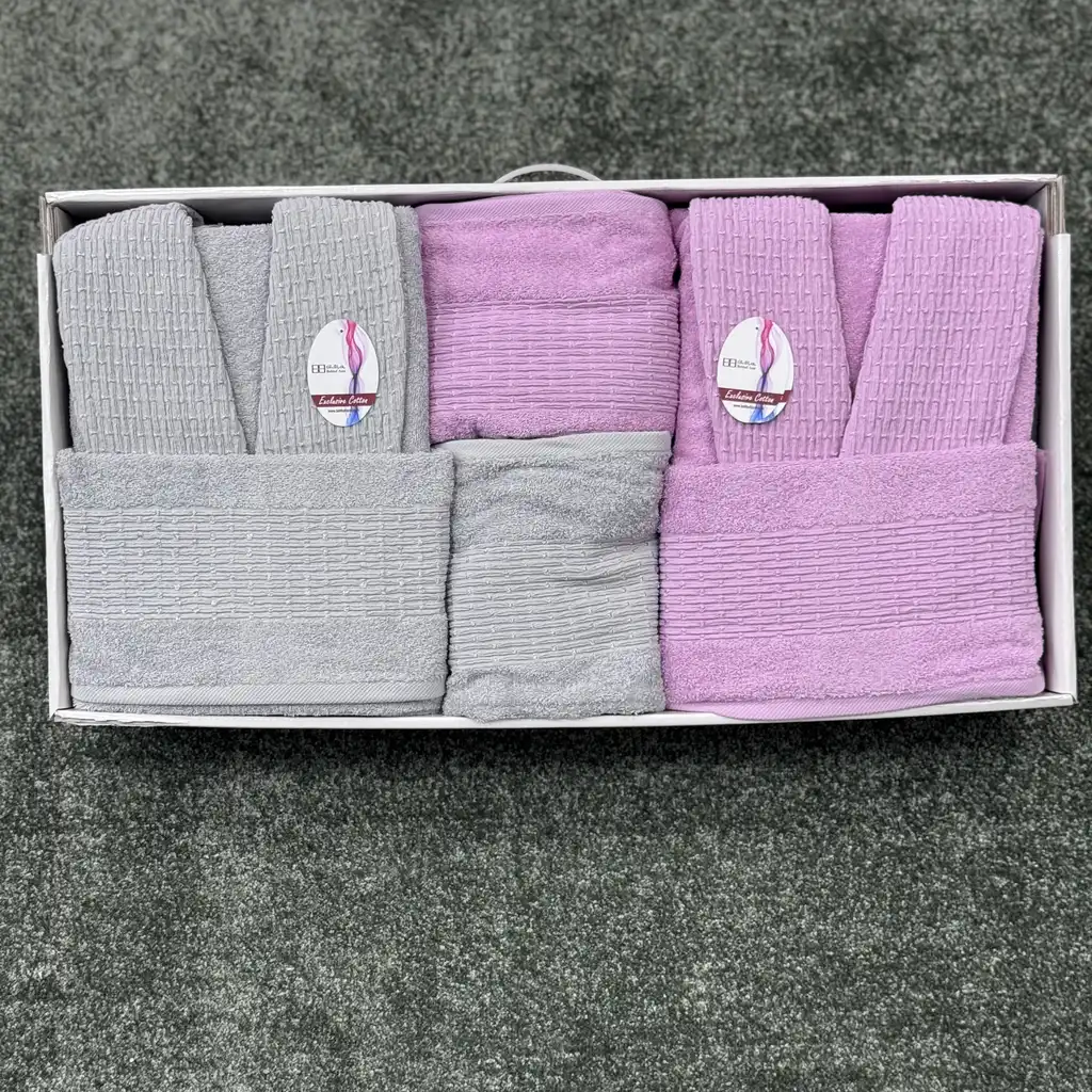 شامل دو عدد حوله تن پوش، دو عدد حوله حمام، دو عدد حوله دست و صورت و دو عدد دمپایی است.